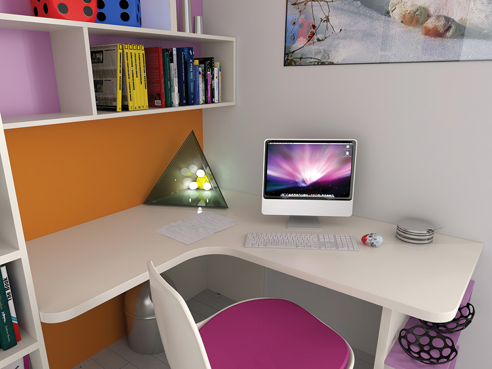 Un angolo studio veramente bello, il piano sagomato ad angolo regala tutta la discrezione e la concentrazione di cui si ha bisogno nei momenti di studio, gli scomparti a